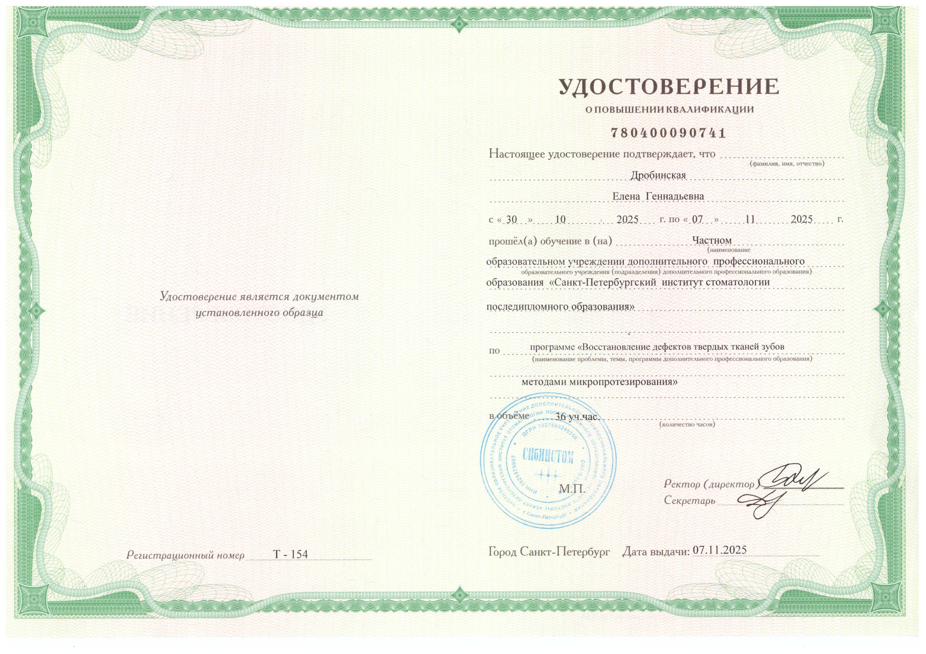- 2015 год - СЗГМУ им. Мечникова, специальность "Стоматология терапевтическая".