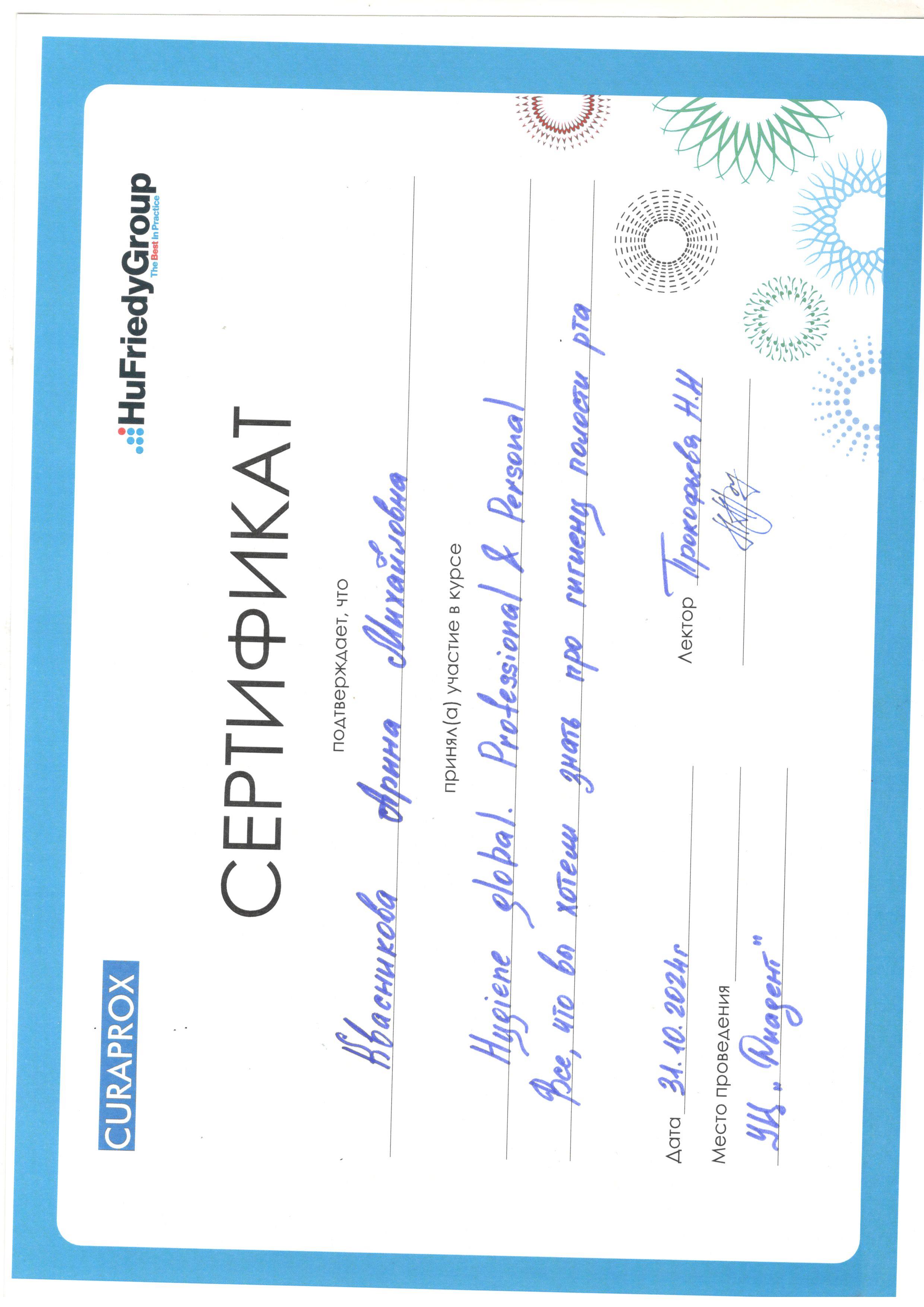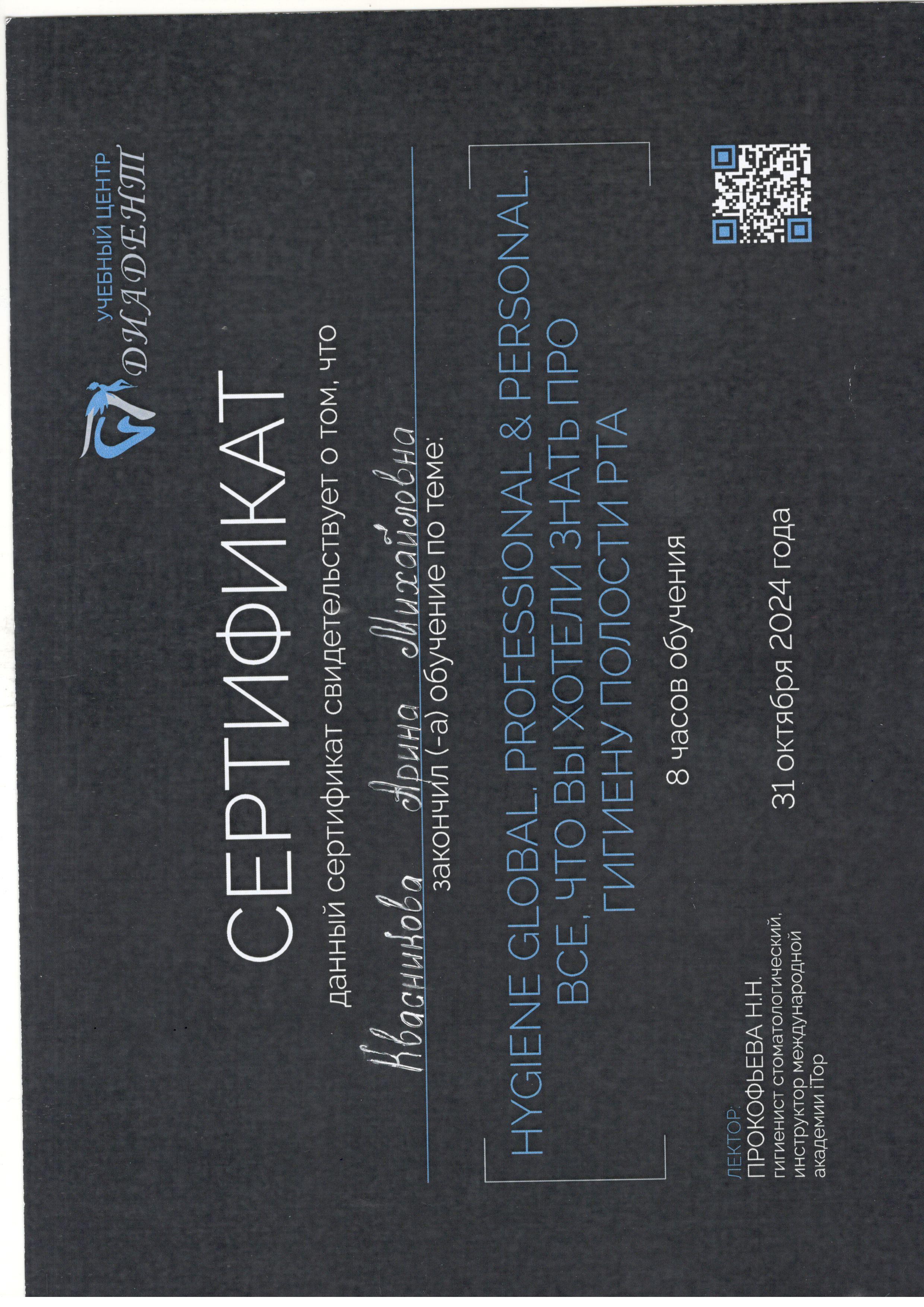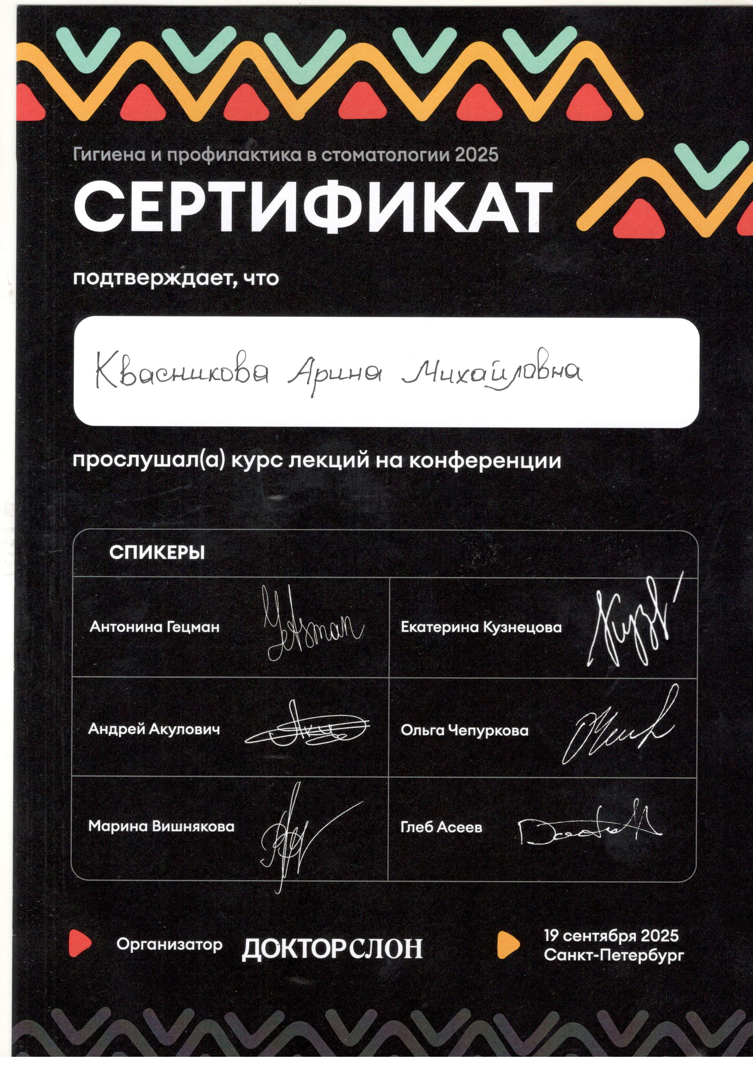 - 2025 год — Сертификат Гигиена и профилактика в стоматологии