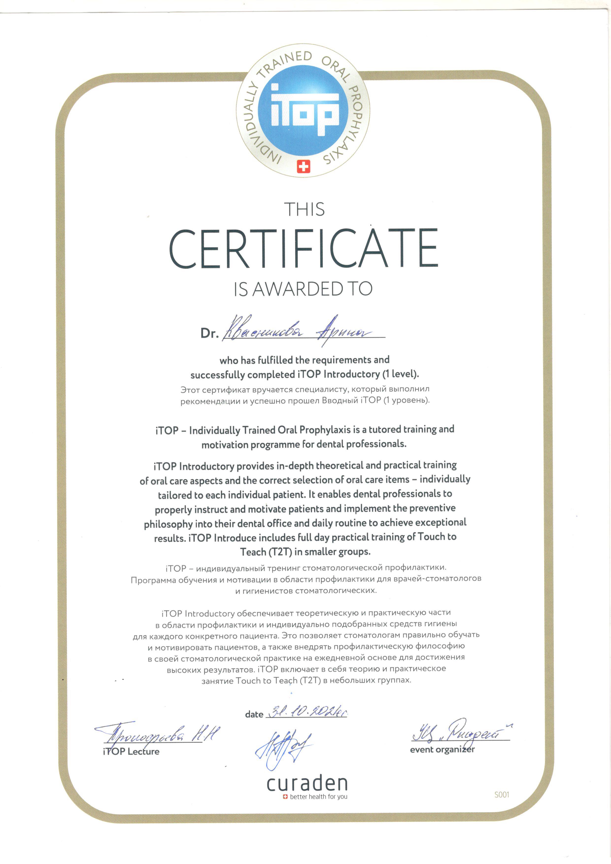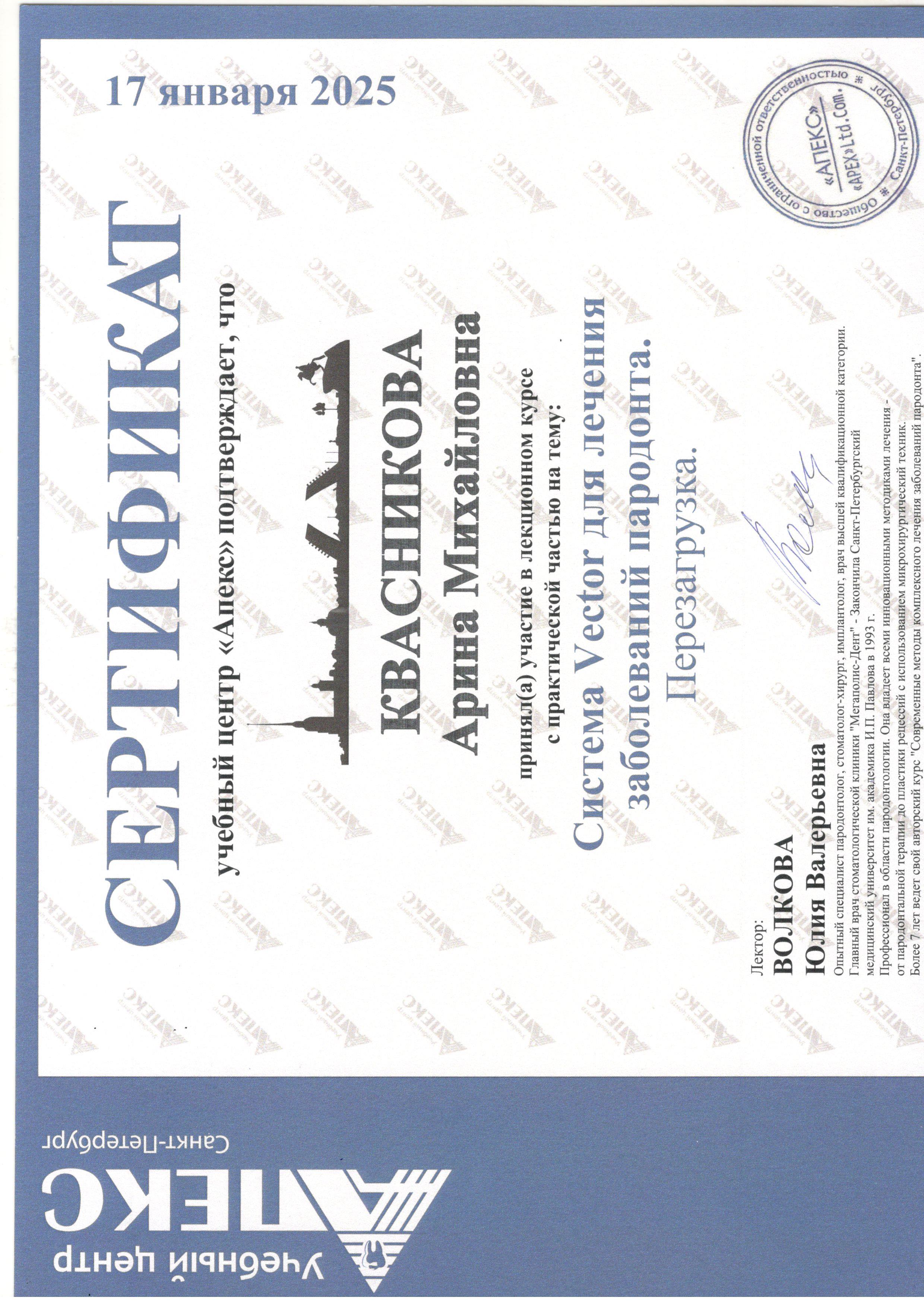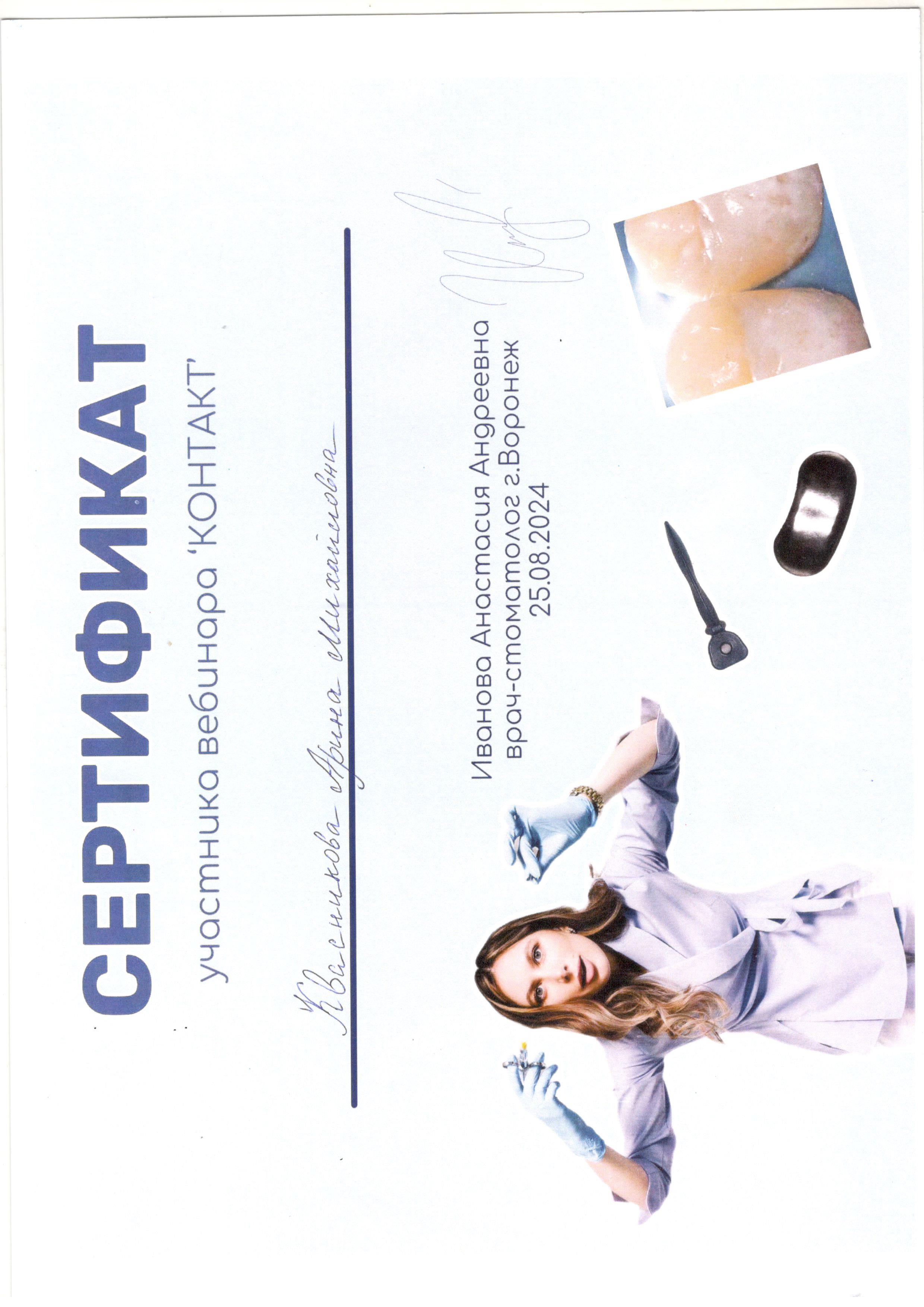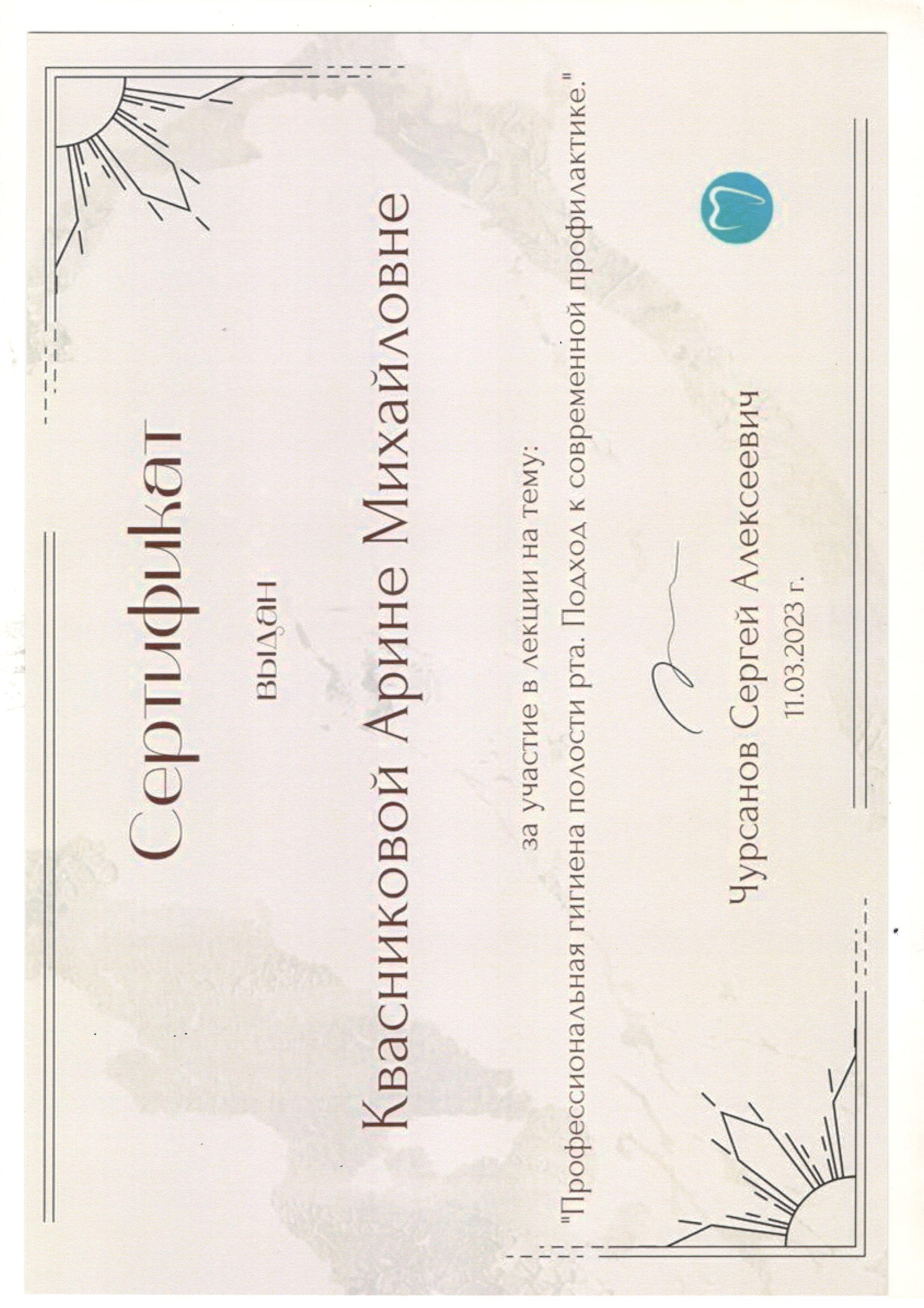 - 2025 год — Сертификат Гигиена и профилактика в стоматологии