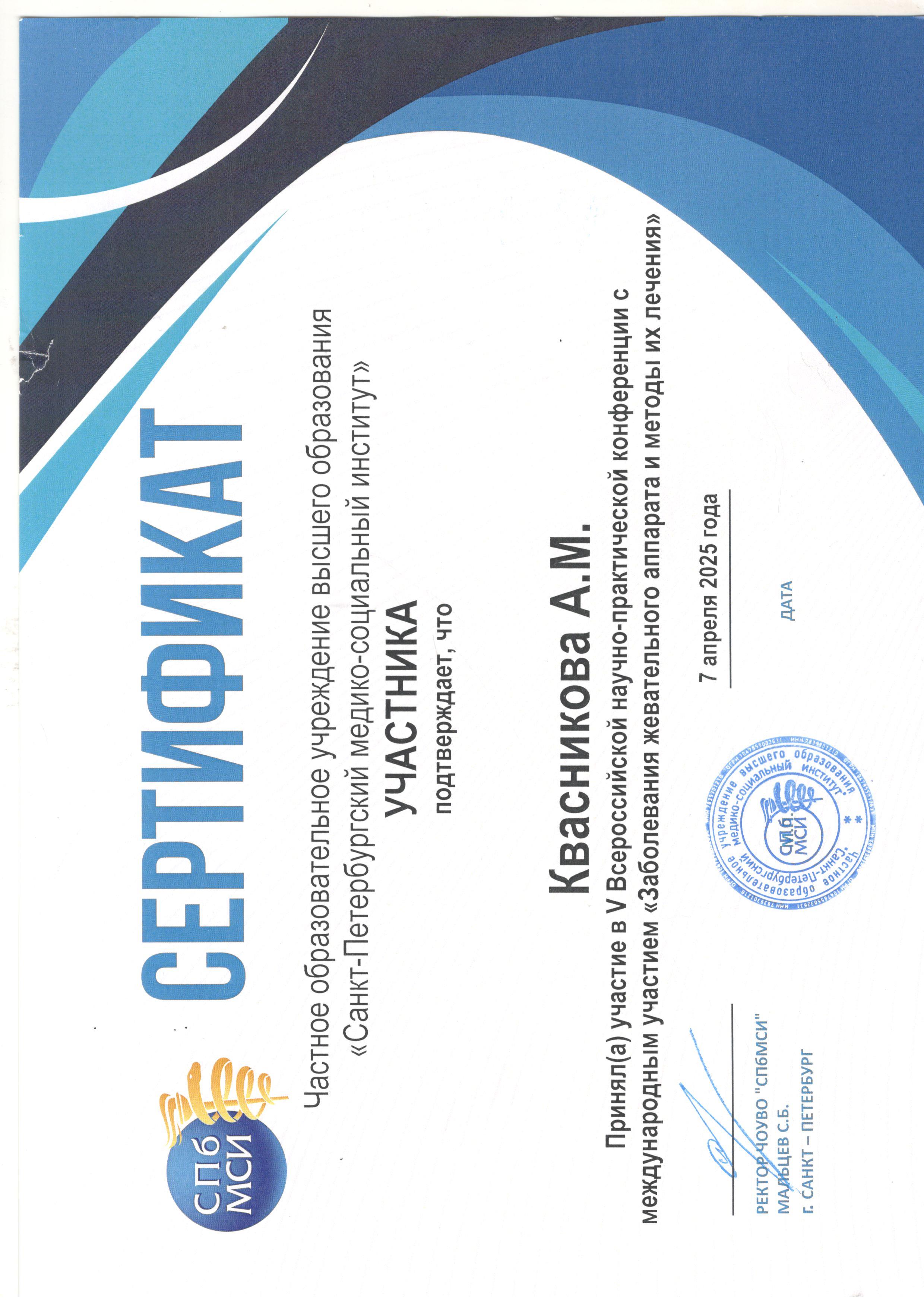 - 2025 год — Участие в V Всероссийской научно-практической конференции с международным участием «Заболевания жевательного аппарата и методы их лечения»