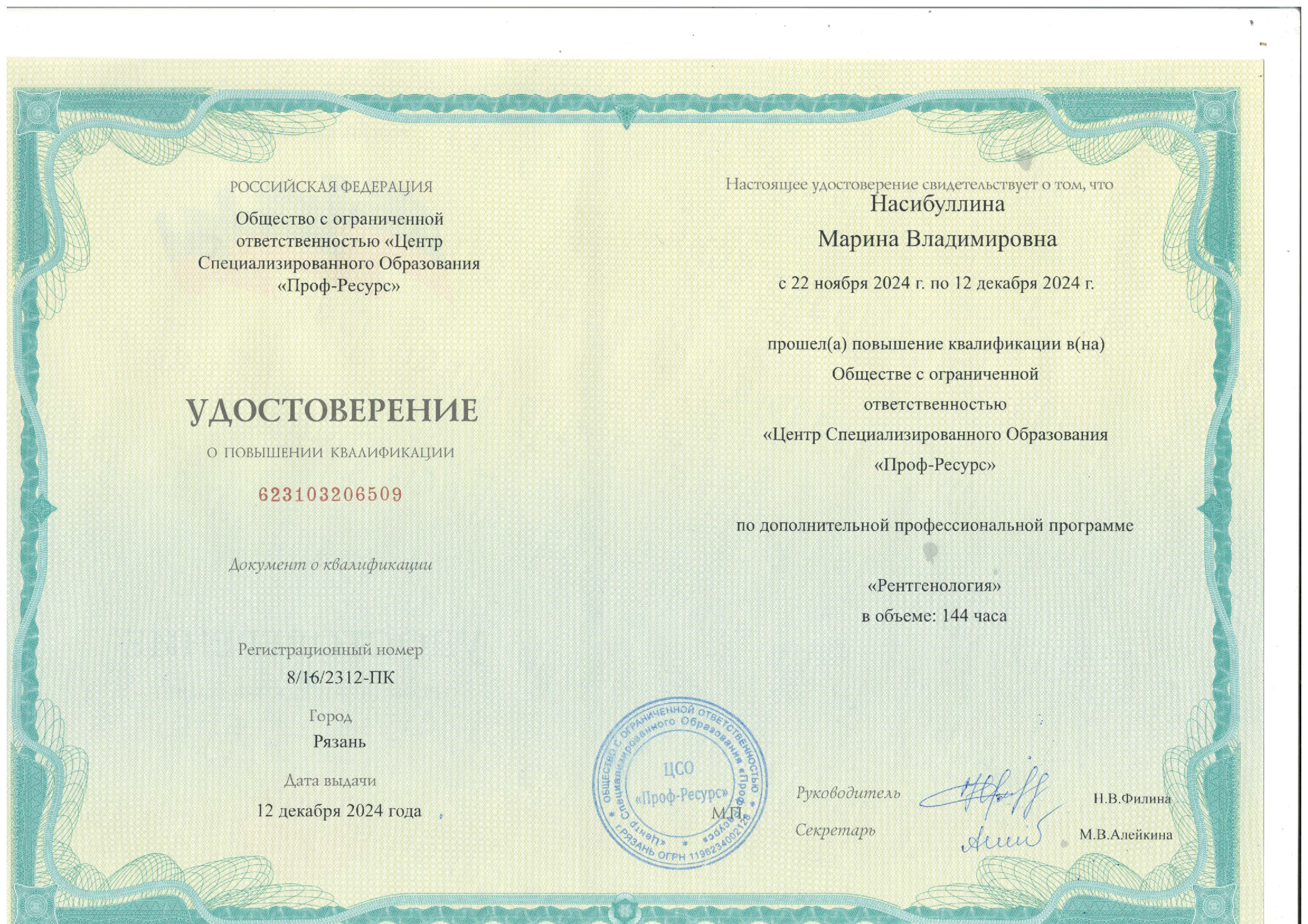 - 2020 год - ООО «Центр специализированного образования «Проф-ресурс», специальность «Рентгенология».