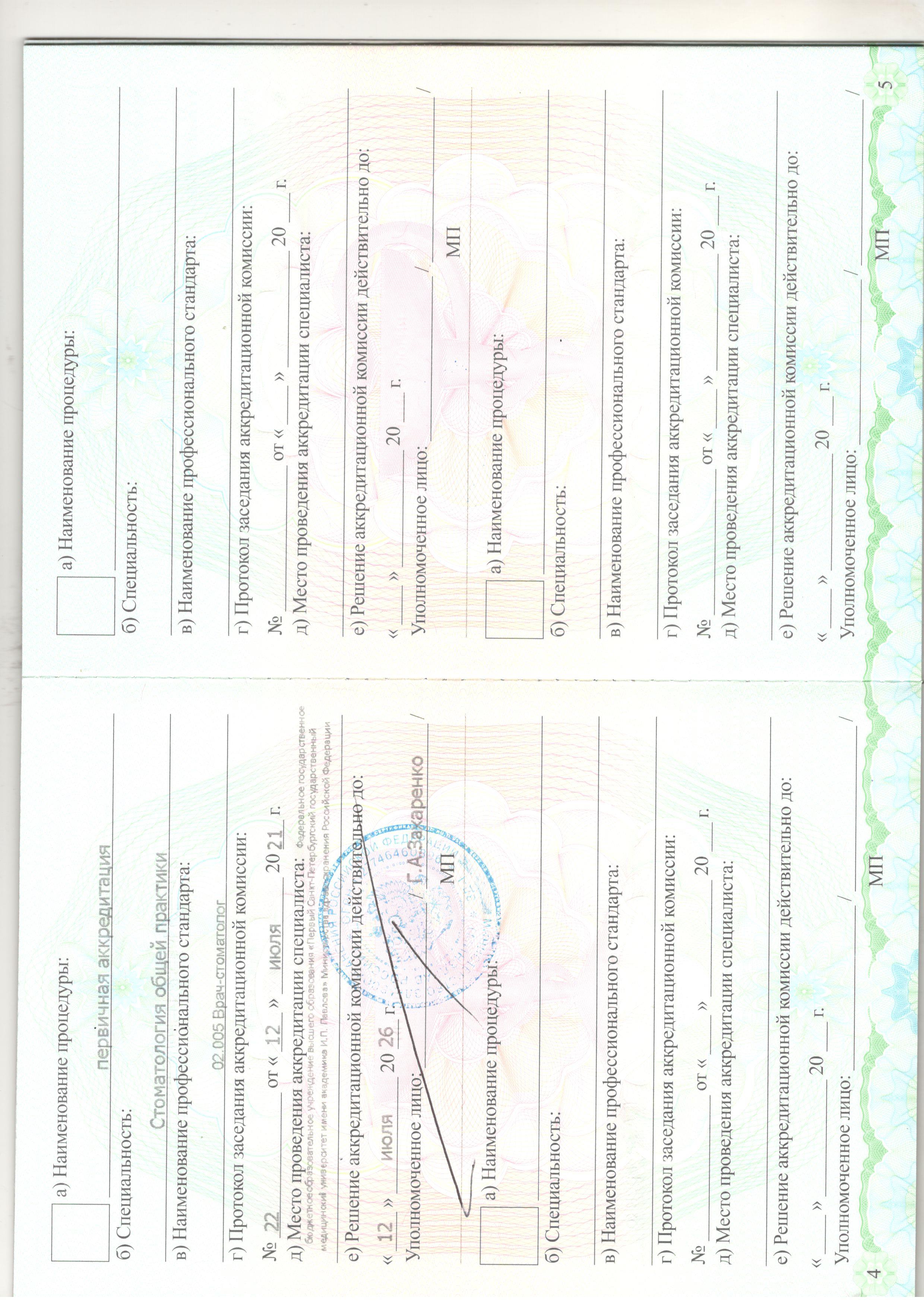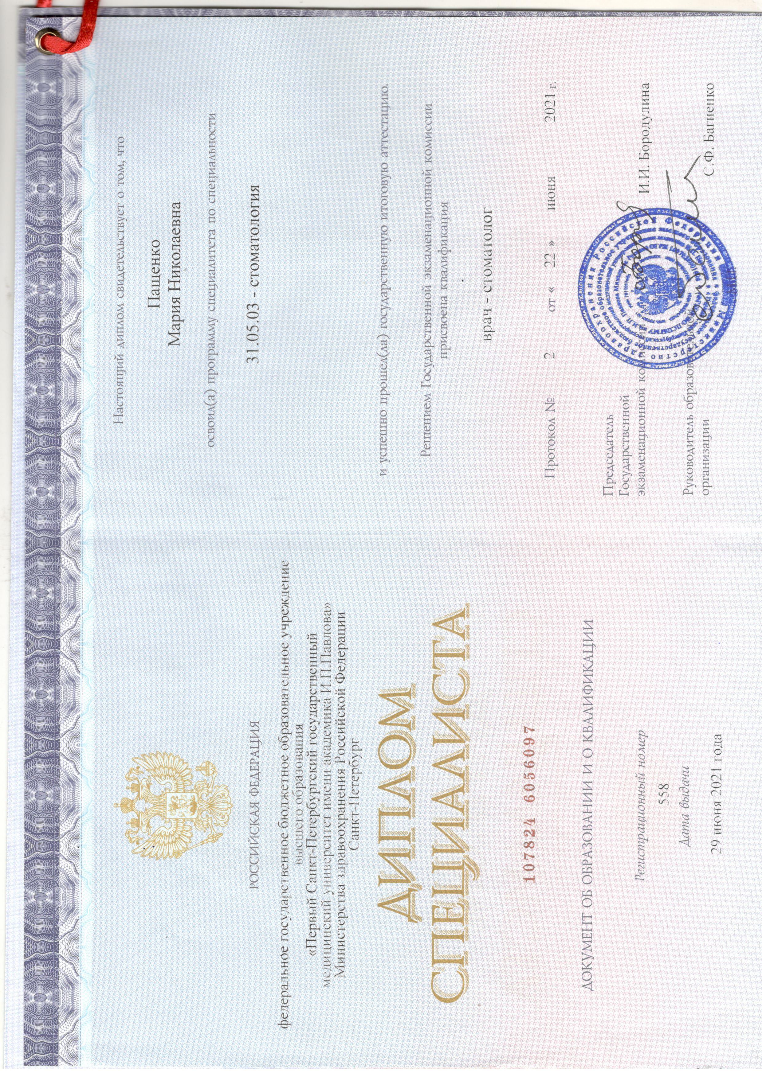 - 2021 год — Первый Санкт-Петербургский государственный медицинский университет им. ак. И.П. Павлова, специальность "Стоматология".