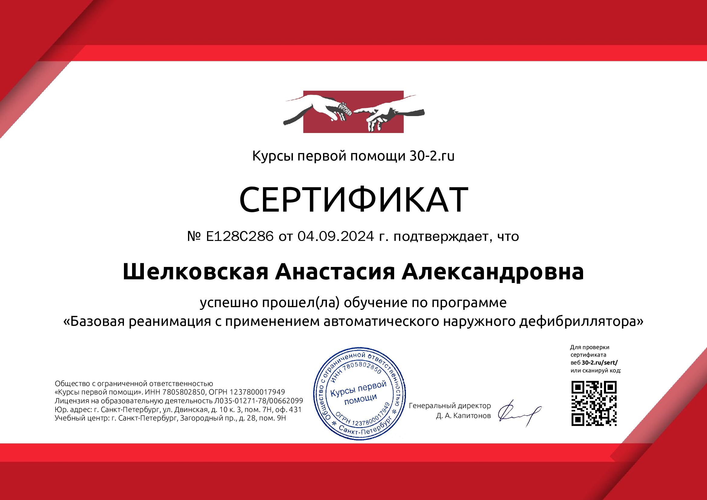 - 2024 год — «Базовая реанимация с применением автоматического наружного дефибриллятора»