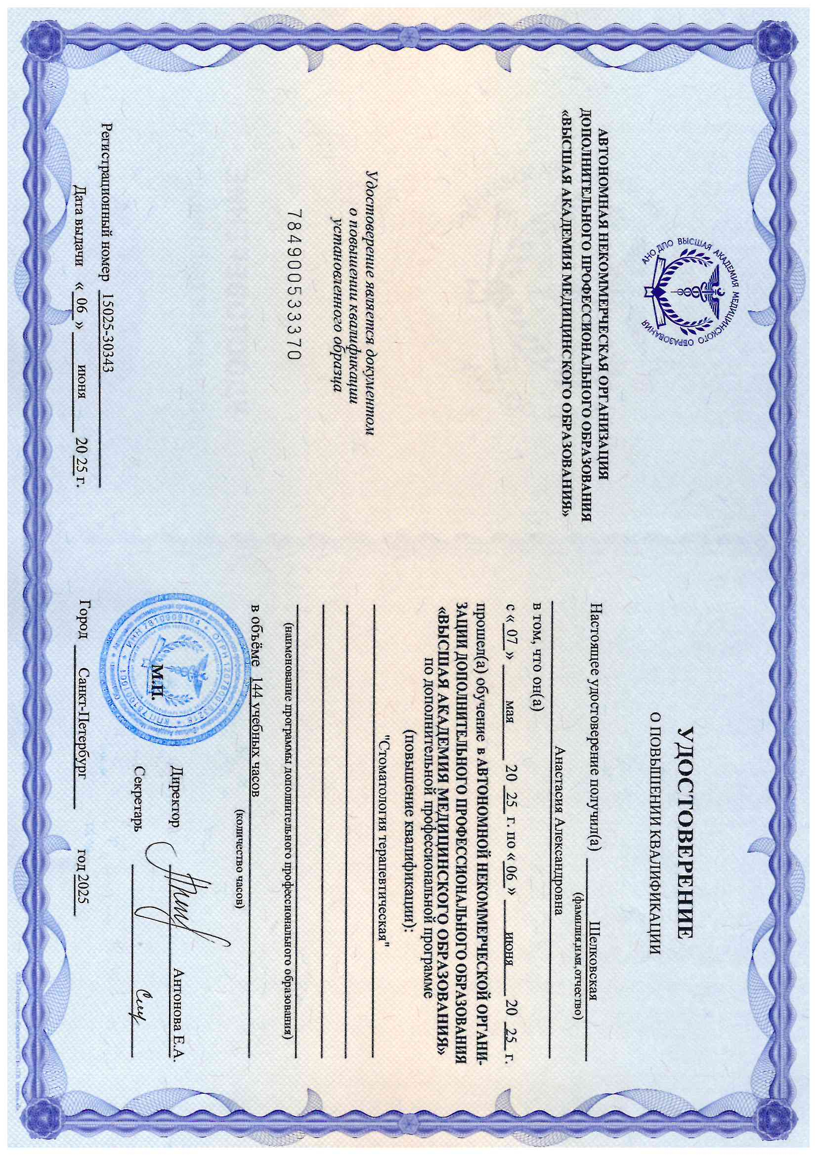 - 2006 год - Военно-Медицинская Академия, специальность "Стоматология терапевтическая"