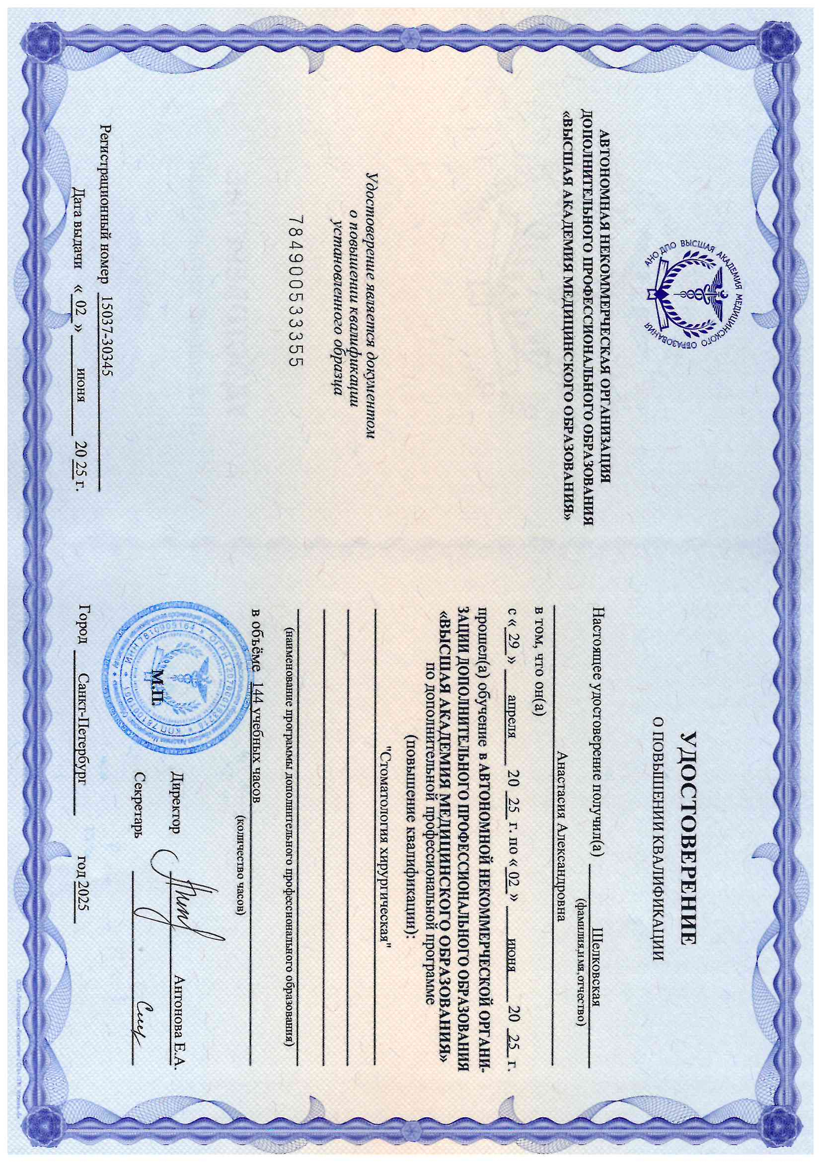- 2006 год – Военно-Медицинская Академия, специальность "Стоматология хирургическая".